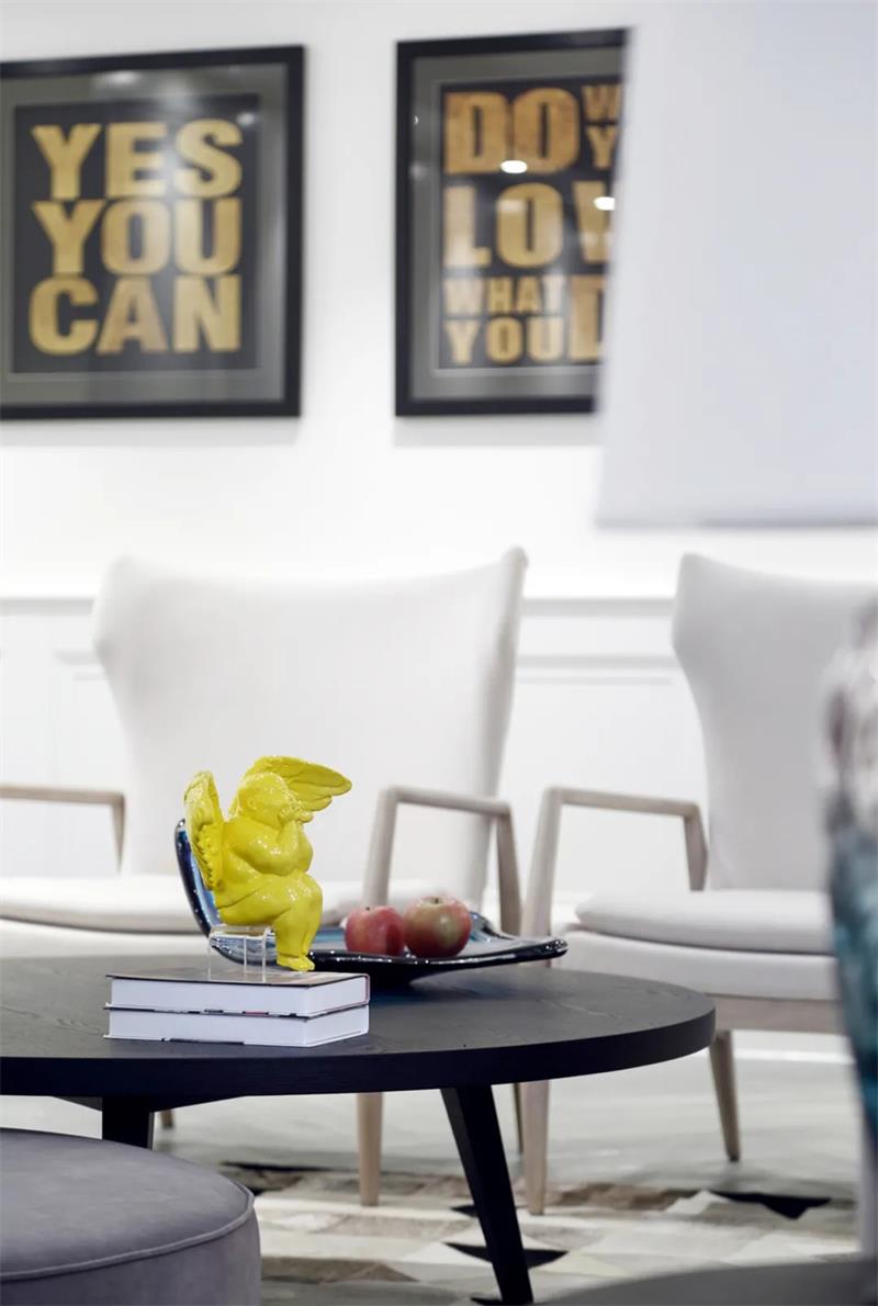 圓潤的餐具將餐廳視覺上的柔軟與溫度表現(xiàn)得淋漓盡致。在這純白無瑕的空間環(huán)境里,黑色的家居、燈飾與裝飾畫在白色肌理里縱情演繹經(jīng)典的氣質(zhì)。餐桌的形態(tài)呼應頂部的吊頂,單調(diào)的空間因此而更加具象與活潑。