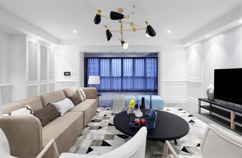 沙發(fā)區(qū)域鋪就一張黑白幾何圖案地毯進行區(qū)域的劃分,淺藍色與卡其布藝沙發(fā)和木質(zhì)座椅相互襯托,整體視覺豐富又協(xié)調(diào)柔和。圓形的黑色茶幾與長方形電視柜體又增添了一些精致感,視野中色彩與材質(zhì)的豐富運用提升了空間的品質(zhì)感。