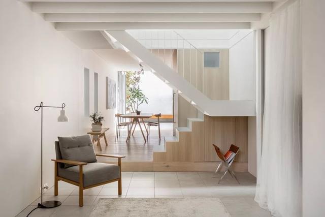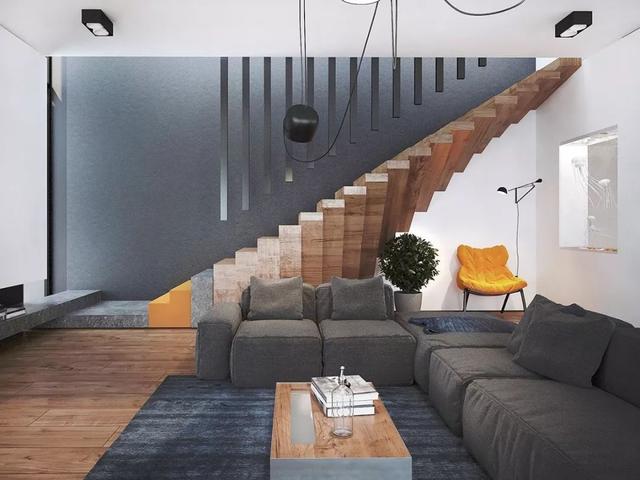 設(shè)計(jì)師運(yùn)用了巧妙的設(shè)計(jì)方法,將兩截樓梯融為一體,像是一個(gè)獨(dú)立的空間,視覺(jué)體驗(yàn)非常的新奇。