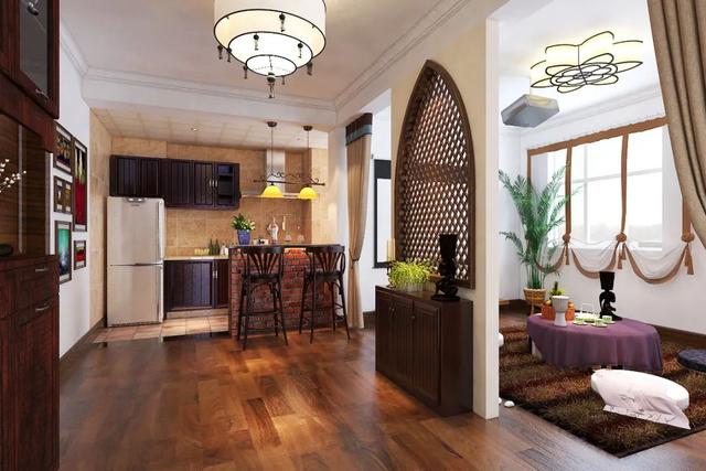 東南亞風(fēng)格,講究色彩艷麗,半啞光漆面黃色系地板,拼花或者雙拼地板來搭配;