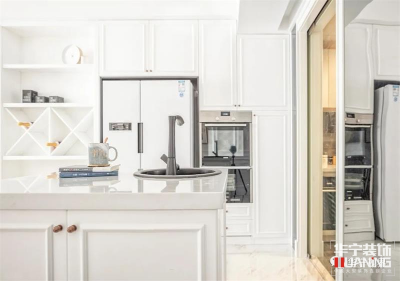 沿著餐廳往里面走,路過吧臺,便來到了廚房。廚房的設(shè)計更加突出實用性,動線流暢,洗、切、煮明確分區(qū),即使三五好友相聚也完全不擁擠。下班回到家,用一頓美食犒勞自己,人間風(fēng)味,皆有滋味。