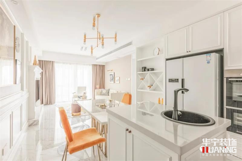 餐廳與客廳之間是敞開式,更顯視覺通透,同時兩個空間完全獨立,互不干擾,餐桌選擇與布置隨空間延伸,完美利用空間。通體白色的主色調(diào)上加入陽光橙,增強食欲,愉悅心情。