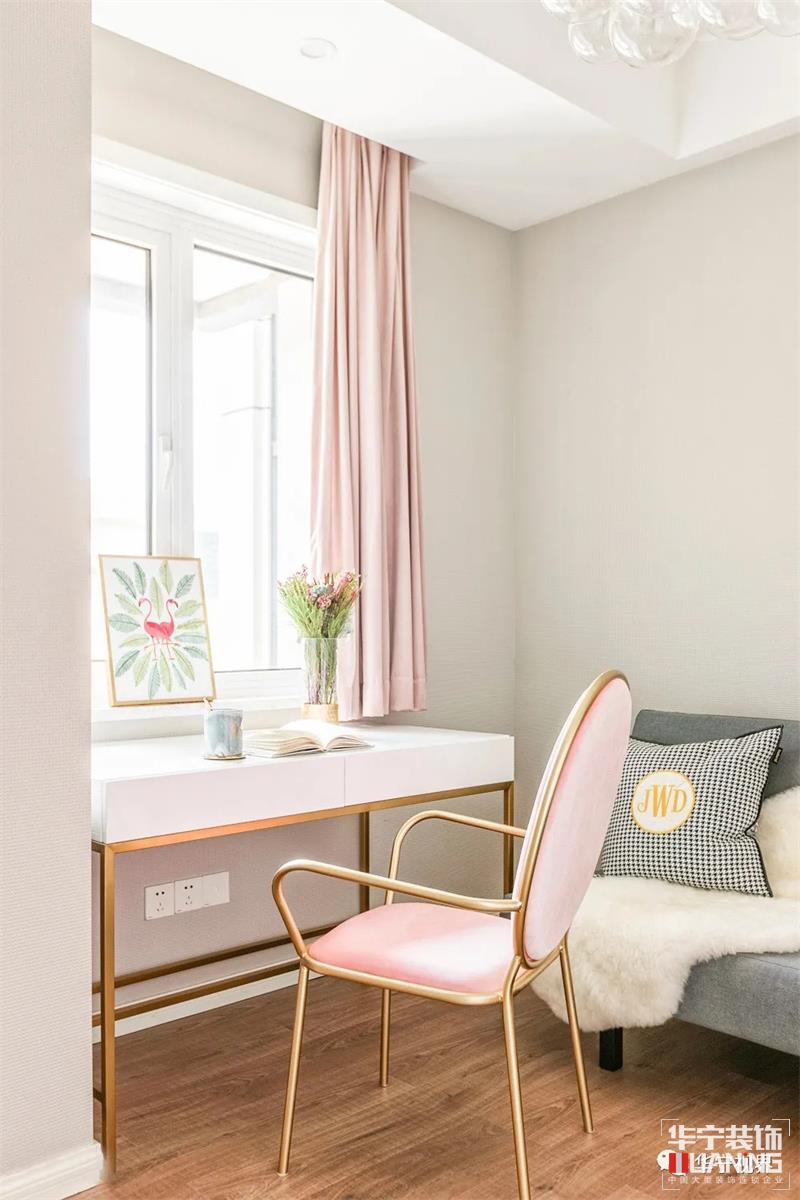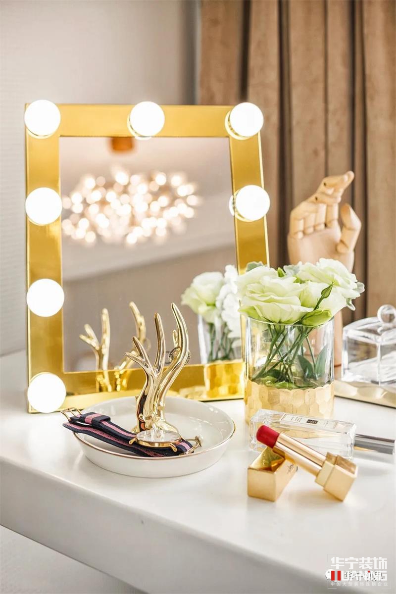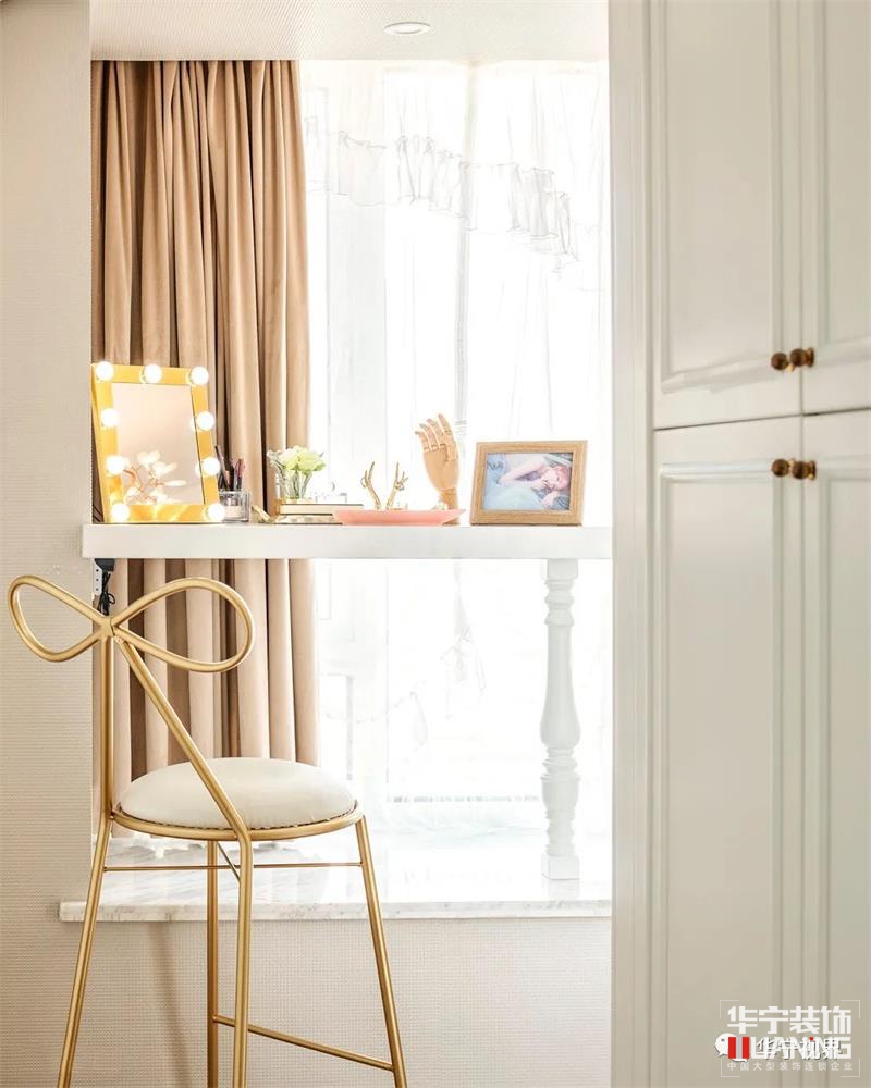 無論是蝴蝶結(jié)靠背座椅還是造型藝術(shù)化的擺件,衣帽間的一品一物都極盡精致之美。窗臺隔出一層平臺放置化妝鏡、香水等生活用品,趁著明亮的光線描摹美妝,這才是令所有女生心動的小確幸。每一個小物件都是愛的印記,藏著故事,刻著時間。