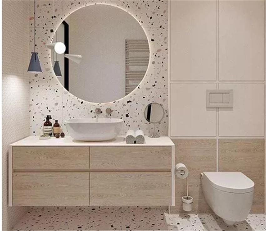 水磨石也是不錯(cuò)的選擇,可能有些人會(huì)覺(jué)得水磨石相對(duì)古老,但可以根據(jù)空間的需求進(jìn)行合理搭配,水磨石搭配淡雅的木色,