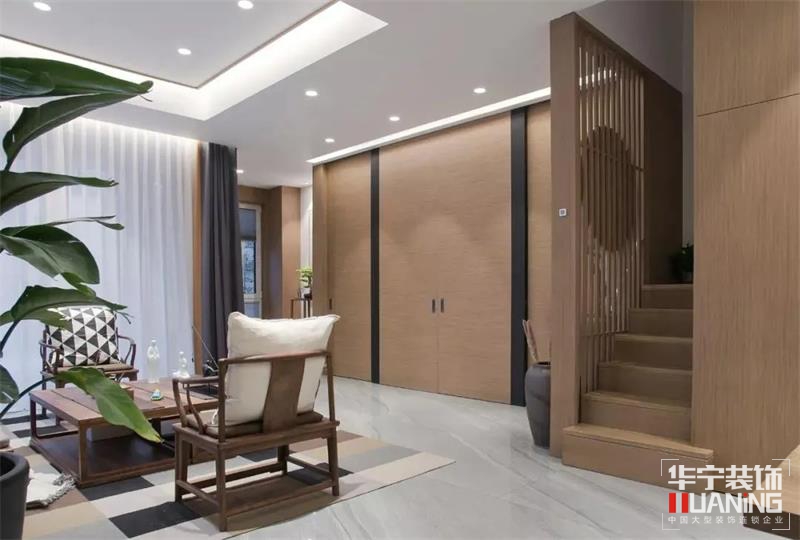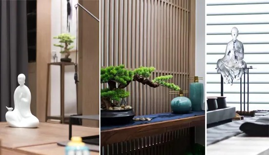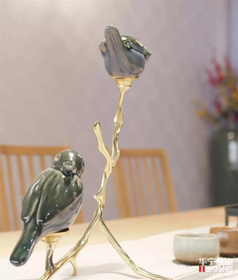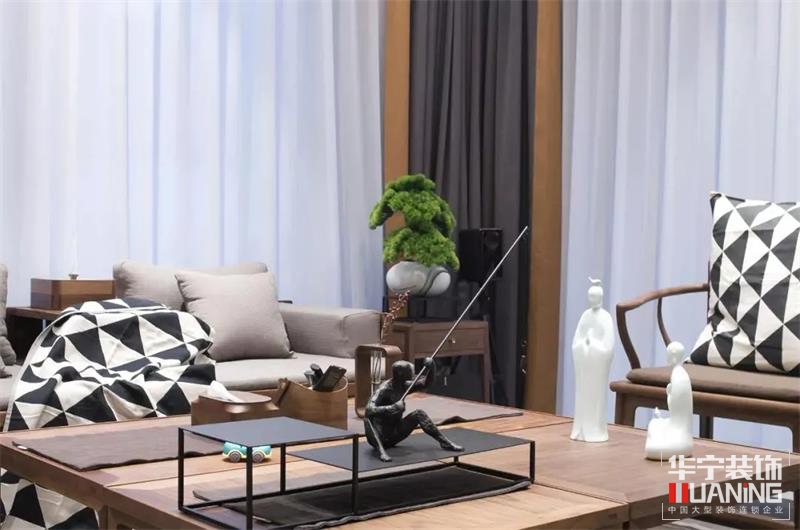 客廳整體以實木為基調(diào),綠植、雕像、銅像等細(xì)節(jié)處點(diǎn)綴的小擺件都是精神意蘊(yùn)的具象表達(dá),富有內(nèi)涵的空間藝術(shù)構(gòu)塑出現(xiàn)代東方的和諧調(diào)性。黑白幾何拼接抱枕以其現(xiàn)代簡約的格調(diào)強(qiáng)化空間秩序,跳躍的色彩增添空間活力。