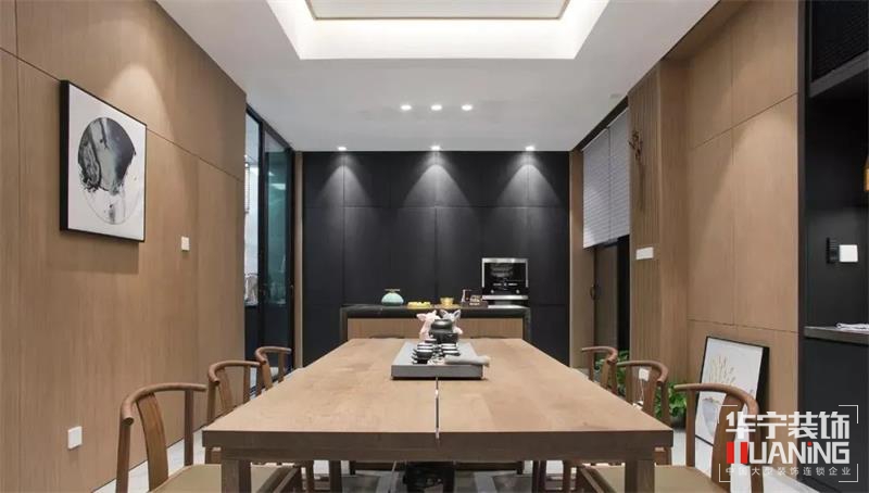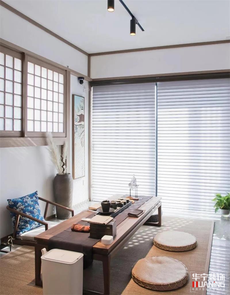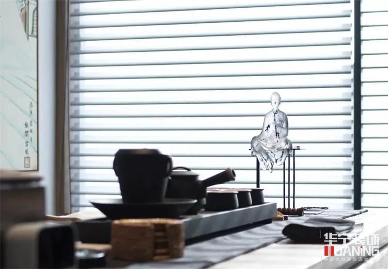 沒有茶室的新中式是不完整的,設(shè)計師在四樓設(shè)計了一個榻榻米式的茶室,空間隱秘安靜。閑坐桌旁,燃一線香,沏一壺茶;飲與友,噶一口,意心生;入喉的是茶,伴隨著茶香;流淌在心底的是生活的詩意;一隅靜謐,內(nèi)心繾綣繚繞。
