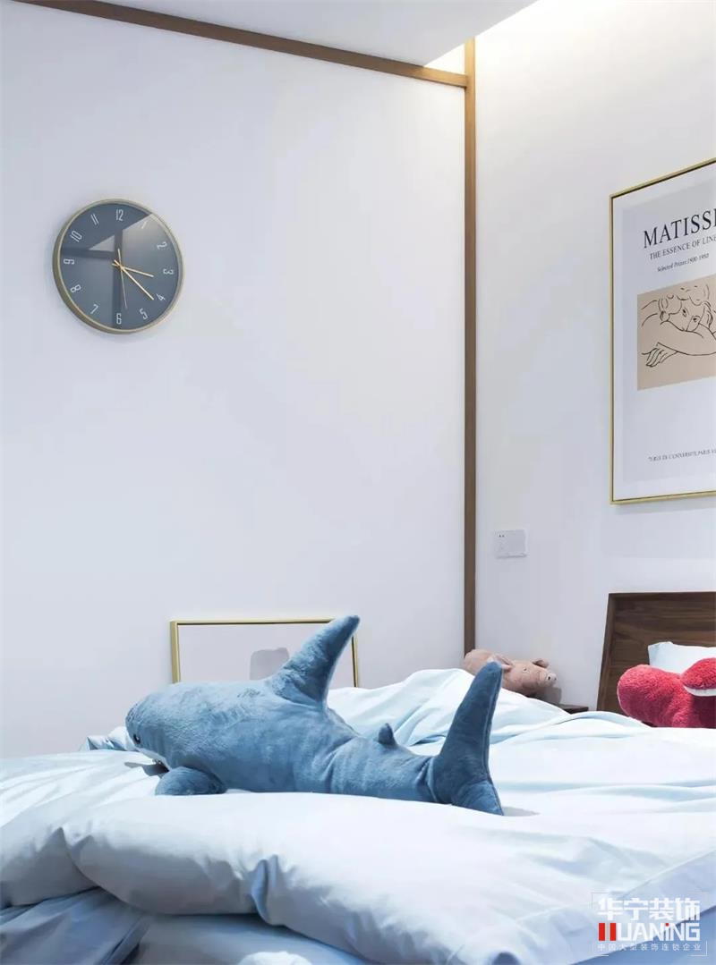 設(shè)計師不僅擅長空間結(jié)構(gòu)利用,同時也尊崇人使用的方便與私密性。二樓是兩個女兒的臥室,每個臥室都采用套房設(shè)計,包含獨(dú)立的衣帽間、衛(wèi)生間與茶水間,舒適而享受。大女兒臥室以丹青色為主色調(diào),純白為底色,木質(zhì)線條勾勒線條輪廓,整體簡約清爽,裝飾畫、小擺件等精致的軟裝搭配突出空間的文藝氣息。