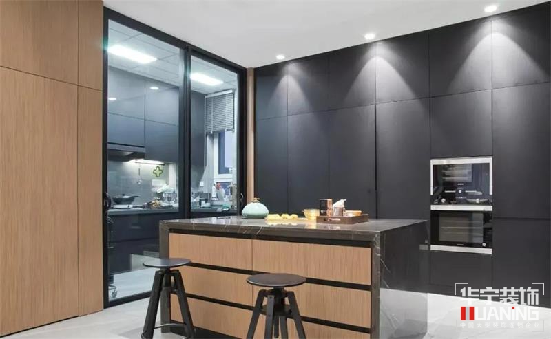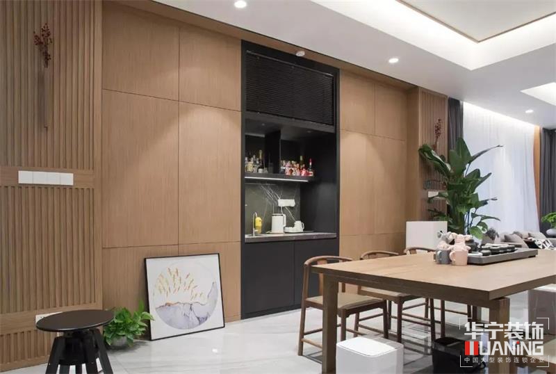 餐廳設(shè)計中西結(jié)合,集實用與美觀于一體。胡桃木色餐桌與黑胡桃木色餐椅以其材質(zhì)的質(zhì)感描摹古韻雅致,保加利亞灰色的大理石盡顯高貴質(zhì)感,與胡桃木色柜門互相營造出中式的現(xiàn)代美感,大面積的餐邊柜代替背景墻,中間為操作臺,既提高了用餐的便利性又解決了收納問題,全屋中央凈水軟水器也隱藏其中。