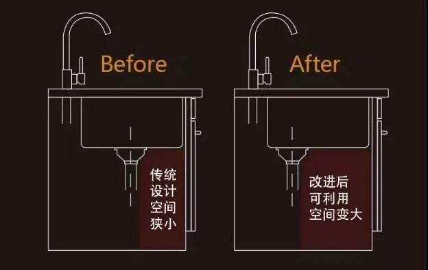 如果櫥柜里想要安裝小廚寶和垃圾處理器,就要求水槽下方空間有更多的空間。傳統(tǒng)的落水會位于水槽中間,將它后移就可以為水槽下方騰出更多空間。