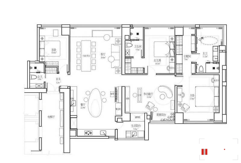 每一個(gè)空間都有屬于它的故事,每個(gè)故事都是不同幸福片段的合集。在有限的空間里,創(chuàng)造出多種幸福的可能,讓當(dāng)下的每一刻都成為永恒的記憶。在這230㎡的寓居空間,設(shè)計(jì)師以「幸福N次方」為題,將對(duì)幸福的多重感受與解讀融入個(gè)性化的生活場景中,為業(yè)主呈現(xiàn)出釋放幸福能量的生活美學(xué)空間。