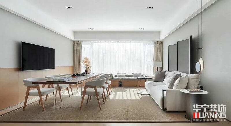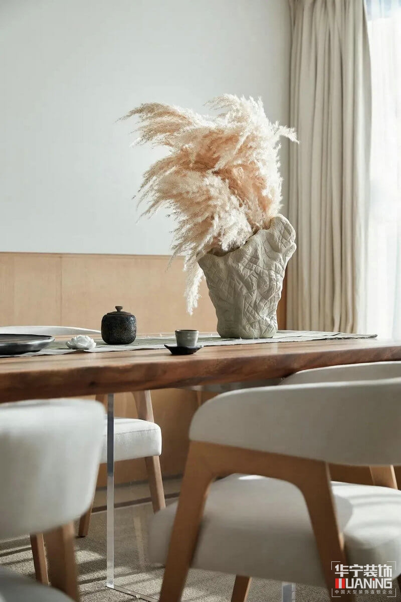 客廳底色以灰色鋪陳陽光明媚的生活剪影,窗臺(tái)閑坐,城景入畫,飄窗軟榻下也考慮了收納場景。木質(zhì)長桌遇上米色云朵般綿軟的沙發(fā),一面朗直,一面溫厚,空間格局緊湊而有力,一氣貫通。