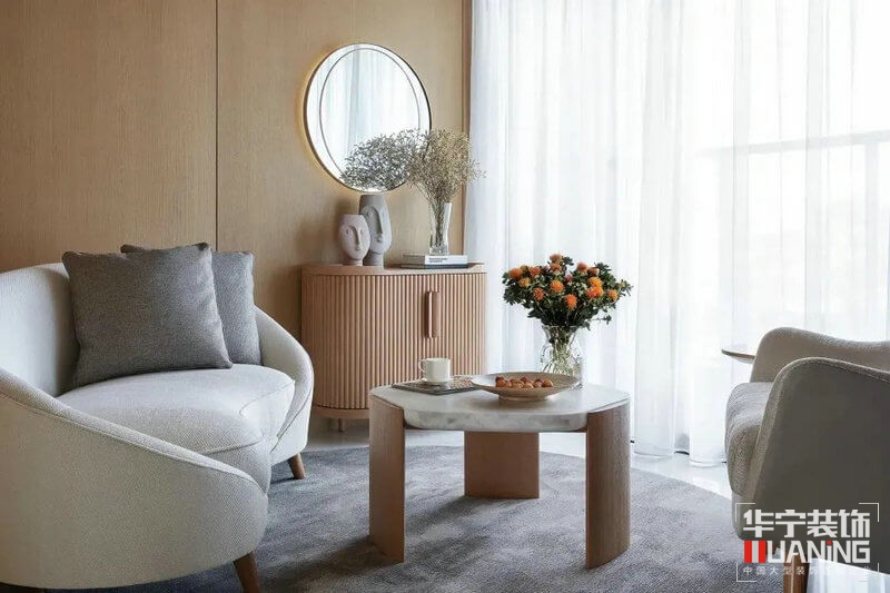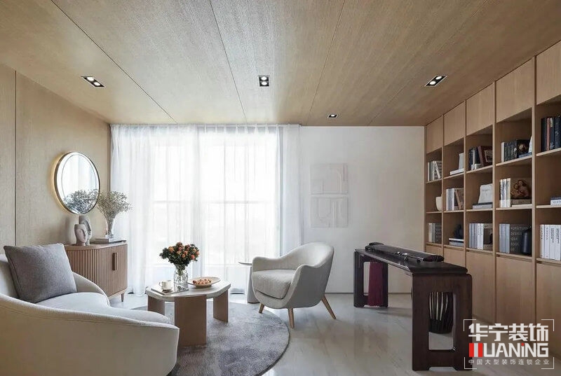 幸福的意義深遠(yuǎn)廣闊,傾聽內(nèi)心的需求,以藝術(shù)的形式完美展現(xiàn)載體,幸福得以緩緩釋放。淡雅木色與通體書柜延續(xù)空間素樸文雅的感受,弧形沙發(fā)與現(xiàn)代簡約圓形茶幾在輕柔的時(shí)光漫舞,閑適意趣隨風(fēng)飛揚(yáng)。