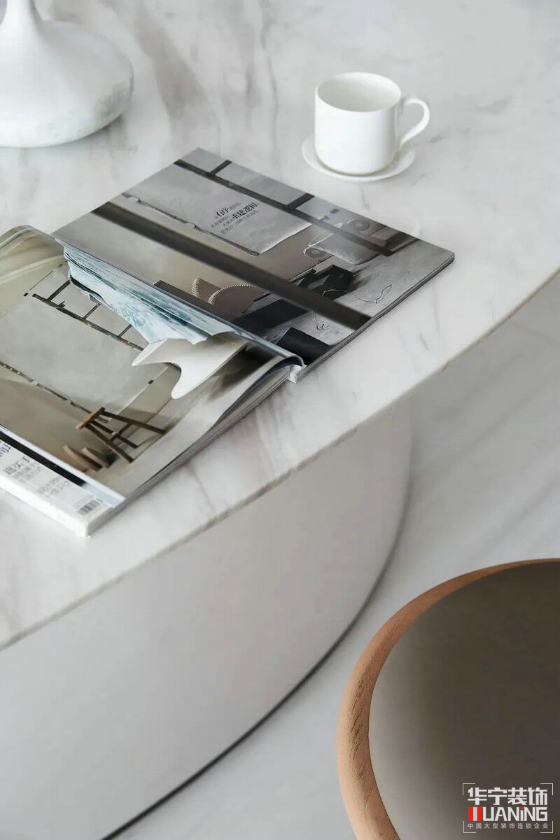 能為幸福的家錦上添花,是設(shè)計(jì)師對(duì)空間最大的敬意。宛若扁舟的中島吧臺(tái)是靜心設(shè)計(jì)的結(jié)果,隱藏式收納,明凈的視感,自然的石材肌理,配合空間情境游刃自如,飽含著居住者對(duì)三餐四時(shí)的生活哲學(xué)。