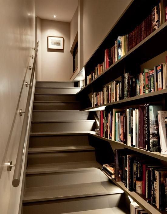 家中有樓梯時(shí),一定不能“放過”這個(gè)可以設(shè)置書架又不會(huì)占用到室內(nèi)其它空間的“好位置”,在樓梯一側(cè)的墻面設(shè)置“擱板式”書架,不但可以有較“充足”的收納空間,而且坐在樓梯踏步上就可以看書;在樓梯下方的側(cè)面設(shè)置書架,收納空間可能會(huì)較小,但是使用方便……