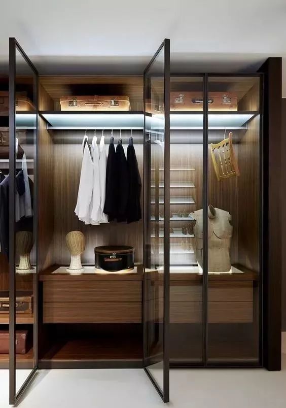 男士衣帽間需要設(shè)計(jì)很多不同高度的隔層或抽屜,用來(lái)放置領(lǐng)帶、襯衫、皮帶等,讓整個(gè)收納看起來(lái)整齊明了,不但拿取方便,而且也是高品質(zhì)生活的象征。