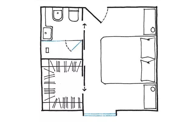 如果你不想通過(guò)一些大膽的嘗試來(lái)打破傳統(tǒng),認(rèn)為保守型的設(shè)計(jì)更符合自己的生活習(xí)慣,也可以?xún)H僅增加一個(gè)轉(zhuǎn)角衣帽間就好了,其他布局保持不變。
