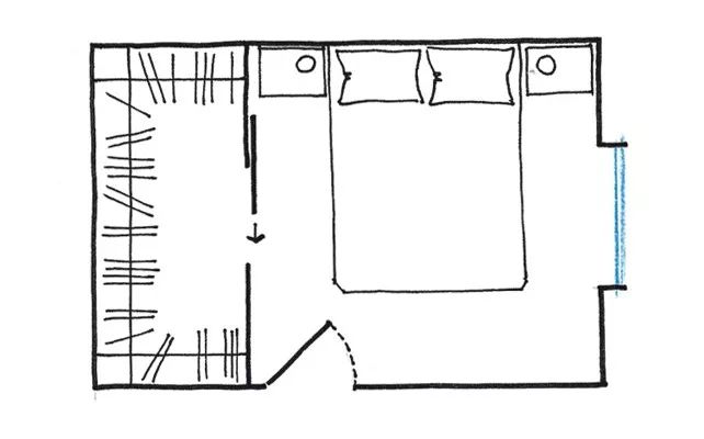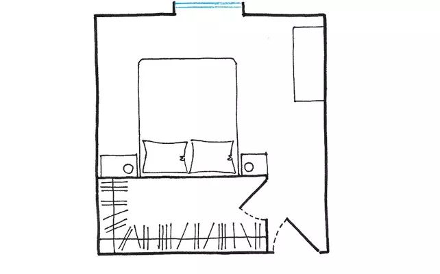 長(zhǎng)方形的臥室可以像下面這樣布局,既不影響生活動(dòng)線(xiàn),又能擁有一個(gè)方便更衣和收納的專(zhuān)用空間。