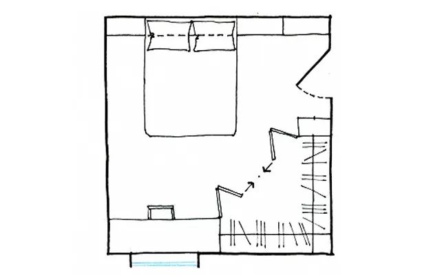 如果臥室的入口正好斜對(duì)室內(nèi)窗戶(hù),你也可以將整個(gè)布局旋轉(zhuǎn)45度進(jìn)行設(shè)計(jì) 在保證基本的生活需求和居住舒適性的基礎(chǔ)上,衣帽間的面積也可以順勢(shì)增大,利用轉(zhuǎn)角瞬間變身為一個(gè)L型衣帽間。
