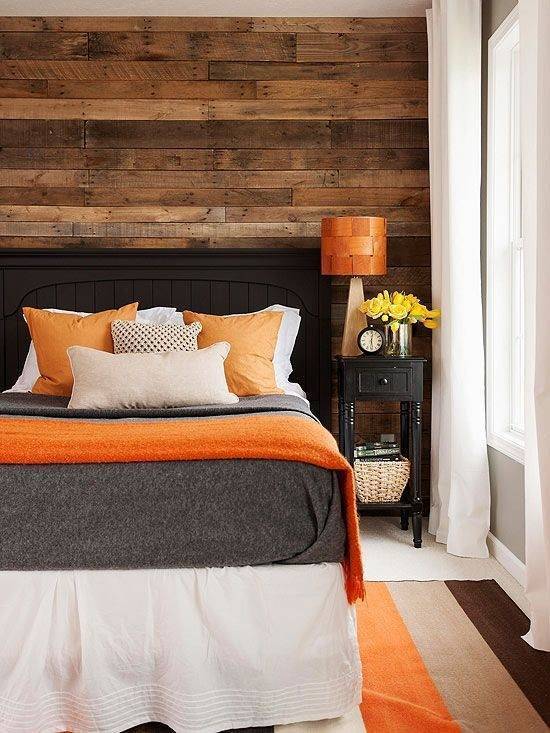 原木色和褐色混合的墻充滿古色古香的原野風情,鮮艷的橙色和素雅的白、灰色床上用品以及窗簾相互平衡,小小空間在色澤上收放自如,渾然天成!