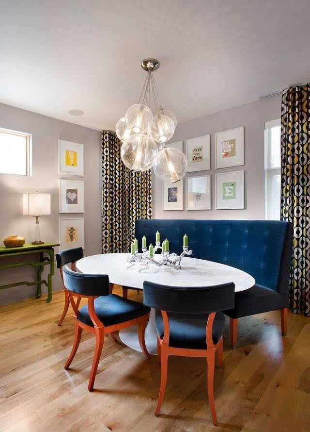 深藍的沙發(fā)和椅子像定海神針,讓空間在視覺上找到了落腳點。墻上的各色簡潔掛畫和醒目的窗簾則讓整個空間都充滿了活躍的音符。