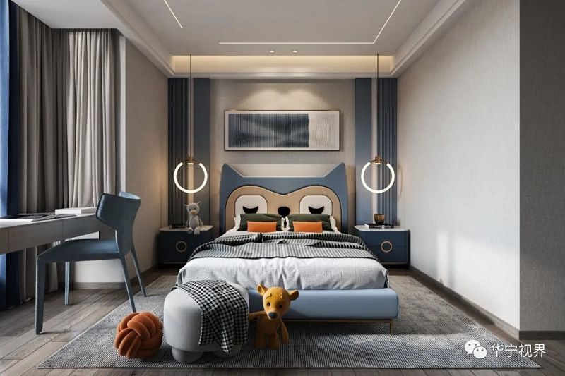 相較于其他空間,男孩子的房間要更活躍現(xiàn)代一些。天真童趣的空間,以淺藍色和灰白色作點綴。男孩房既有屬于自己的學(xué)習(xí)天地,又給予充足的空間玩耍嬉戲,學(xué)習(xí)娛樂兩不誤。