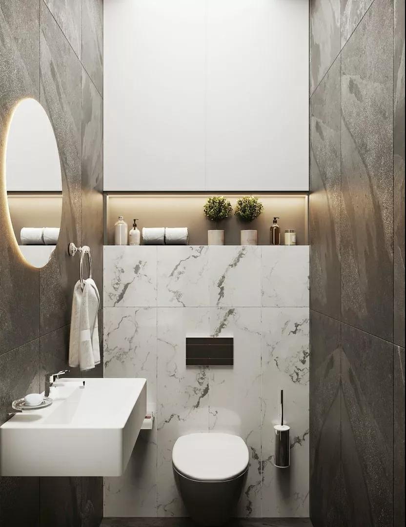 上下壁柜的中間部分,也可采用留空設計,再于柜子底部安裝燈帶,擺放綠植、香薰、書籍、毛巾等必備用品,整個墻面看起來就更有層次感了,衛(wèi)生間的顏值也大大提升。
