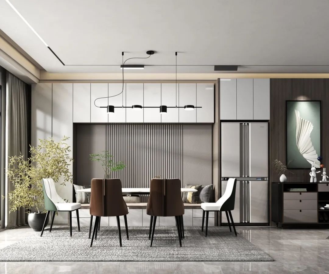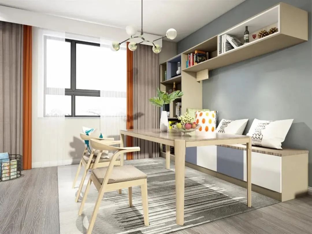 卡座+餐邊柜+餐桌,吊柜/地柜/側(cè)邊柜,都可以實(shí)現(xiàn)收納功能。無論是吃飯、聊天還是工作都會非常愜意。