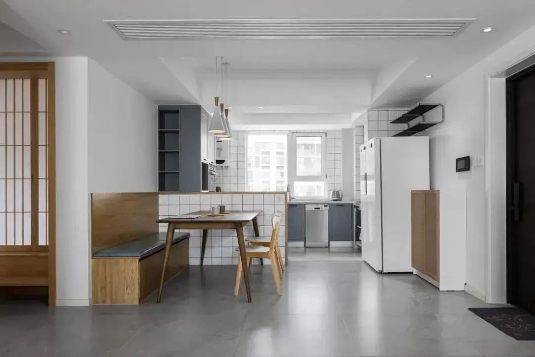 卡座+矮墻,實(shí)現(xiàn)客餐廳間的劃分,這個(gè)矮墻還可以實(shí)現(xiàn)收納、吧臺等功能,特別適合LDK模式的家庭。