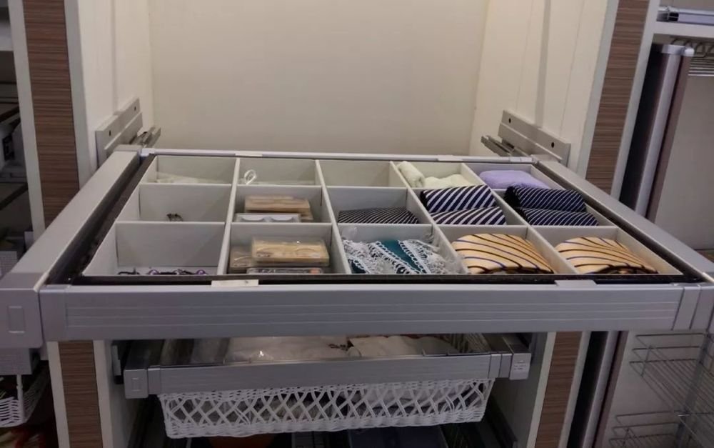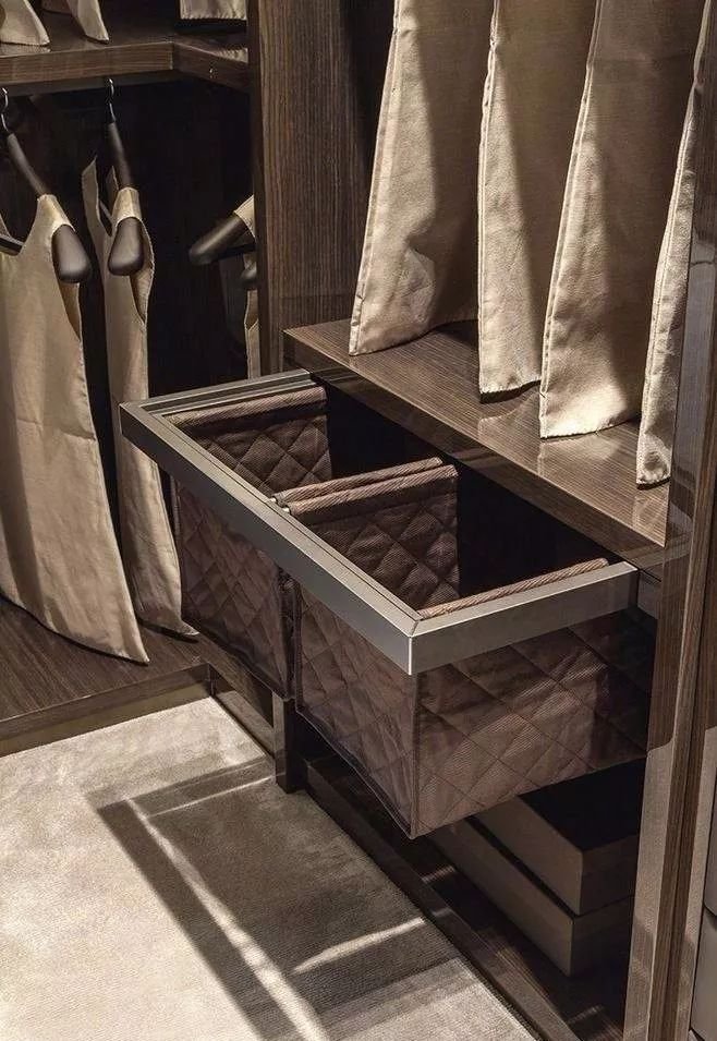 四邊拉籃:為了提高衣帽間的容積,在有限的空間存放更多的物品,可以選擇帶滑軌的四邊拉籃,適合存放純毛料等不易折皺的衣服,不容易發(fā)霉、蟲蛀。