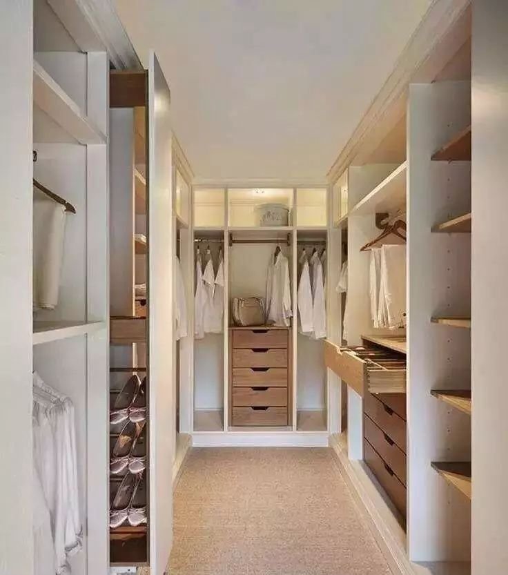 獨立式衣帽間的內(nèi)部形式根據(jù)現(xiàn)有的空間格局而定,正方形多采用U形排布;狹長形的空間一般選擇平行排布;若空間呈寬長形,則適合L形排布。大家可以參照空間的形狀選擇適合的空間布局。