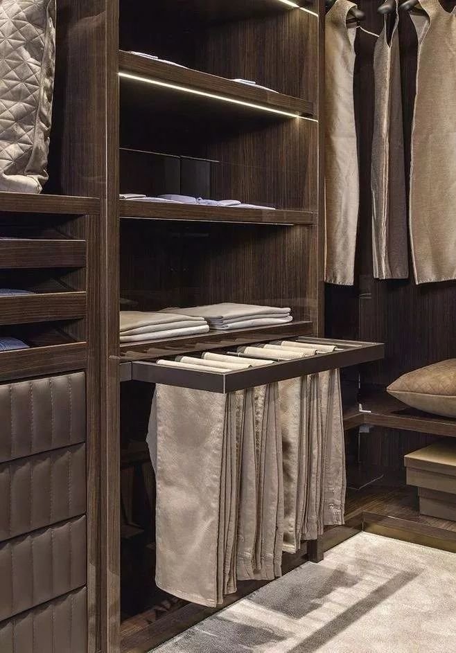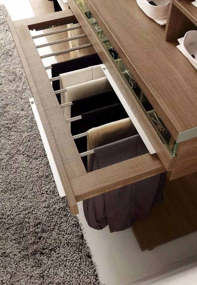 掛桿:帶滑軌的金屬掛桿是衣帽間的一大特色,阻尼靜音設(shè)計的滑軌,抽拉更加順滑,還不會劃傷衣物,很適合掛放高級絲巾、領(lǐng)帶、圍巾、披肩等配飾。