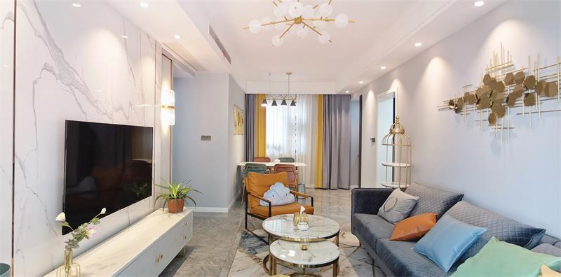 ▲ 電視背景墻,整個(gè)背景墻做了大理石設(shè)計(jì),搭配黃銅裝飾,盡顯輕奢風(fēng)格,實(shí)木的電視柜尺寸剛好,整體的裝飾一體感很強(qiáng)。