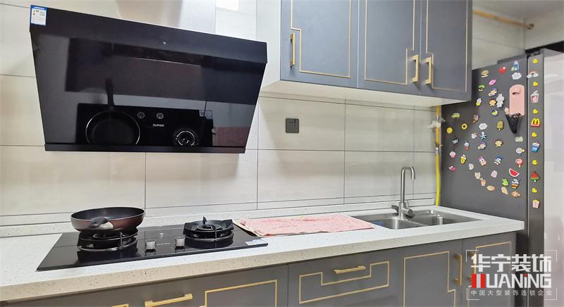 ▲ 這樣的廚房,讓做飯的時(shí)間都變得有趣。淺灰色的櫥柜門,配上輕奢風(fēng)的金屬把手,每一次觸摸把手,拿取餐具的觸感都會(huì)讓做飯的人心情愉悅~