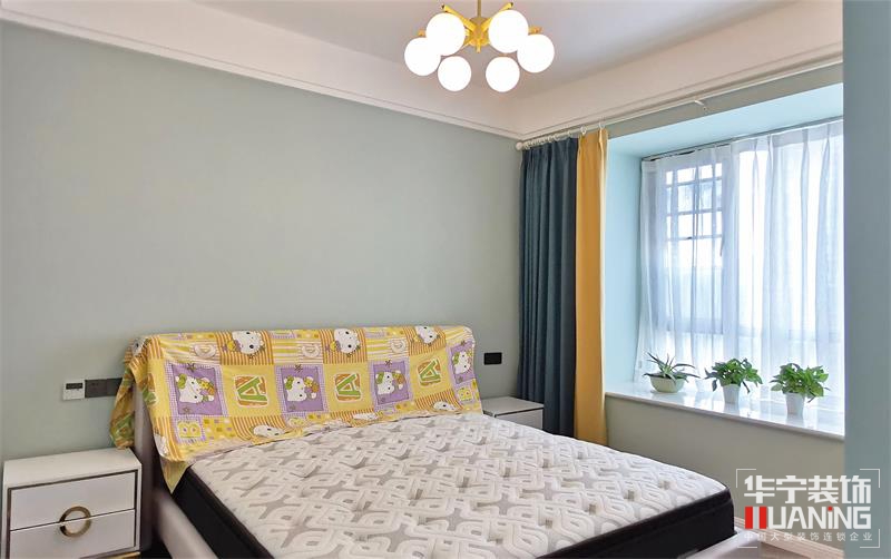 ▲ 臥室,背景墻做了淺藍(lán)色的色調(diào),設(shè)計(jì)與飄窗相連的榻榻米,將空間物盡其用。