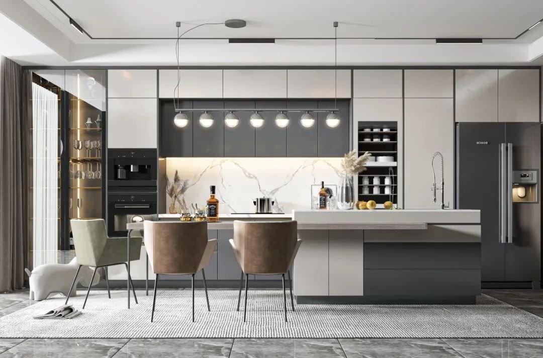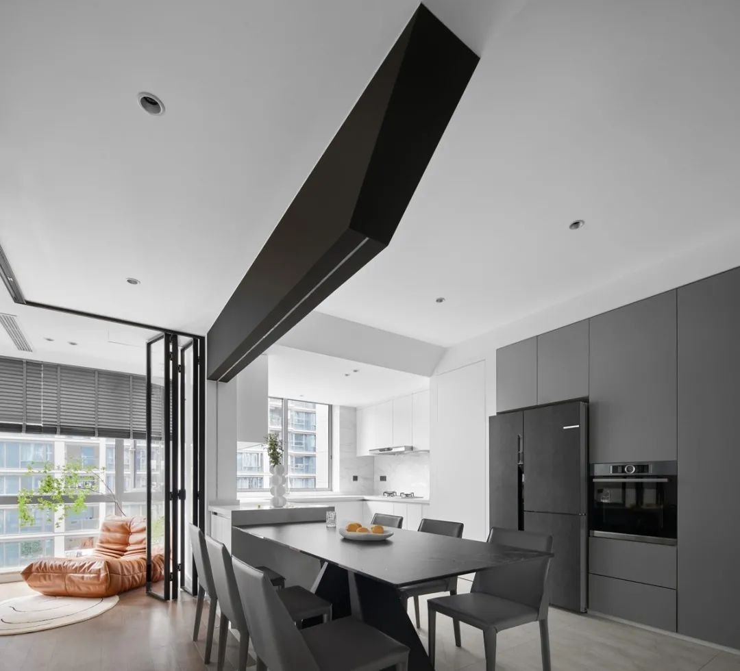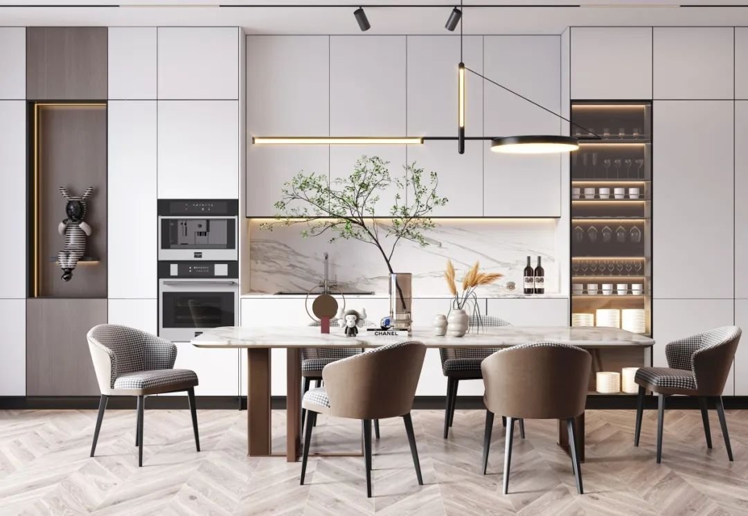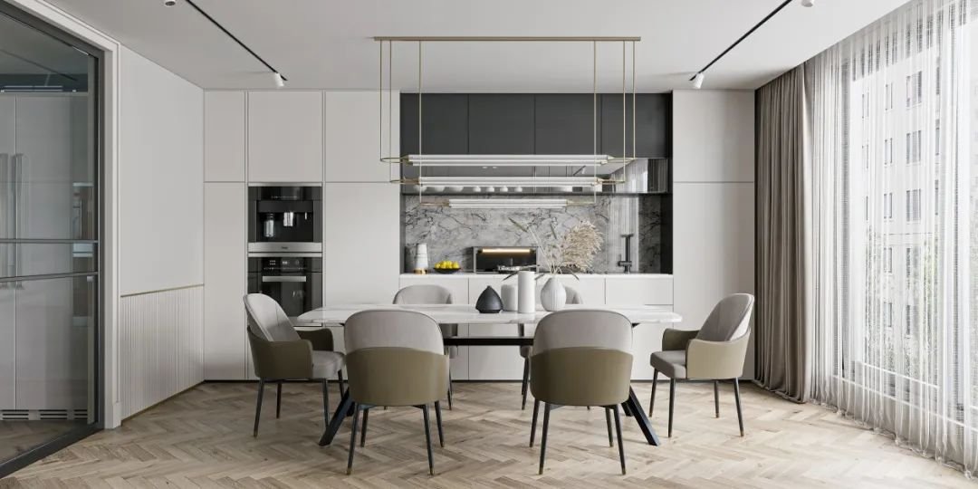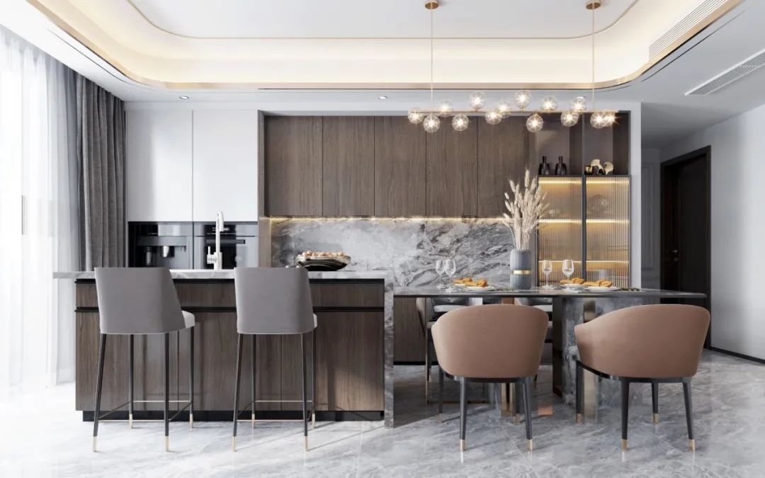 把中西廚分開(kāi),中廚獨(dú)立布局,西廚以島臺(tái)、吧臺(tái)、餐邊柜等形式呈現(xiàn),完美避開(kāi)燃?xì)獾陌踩[患: