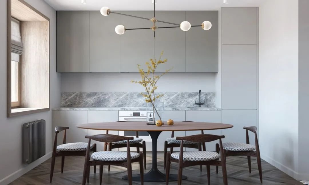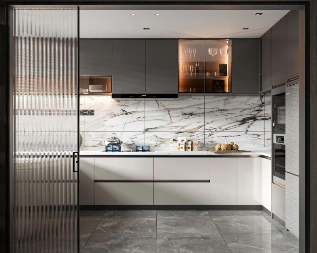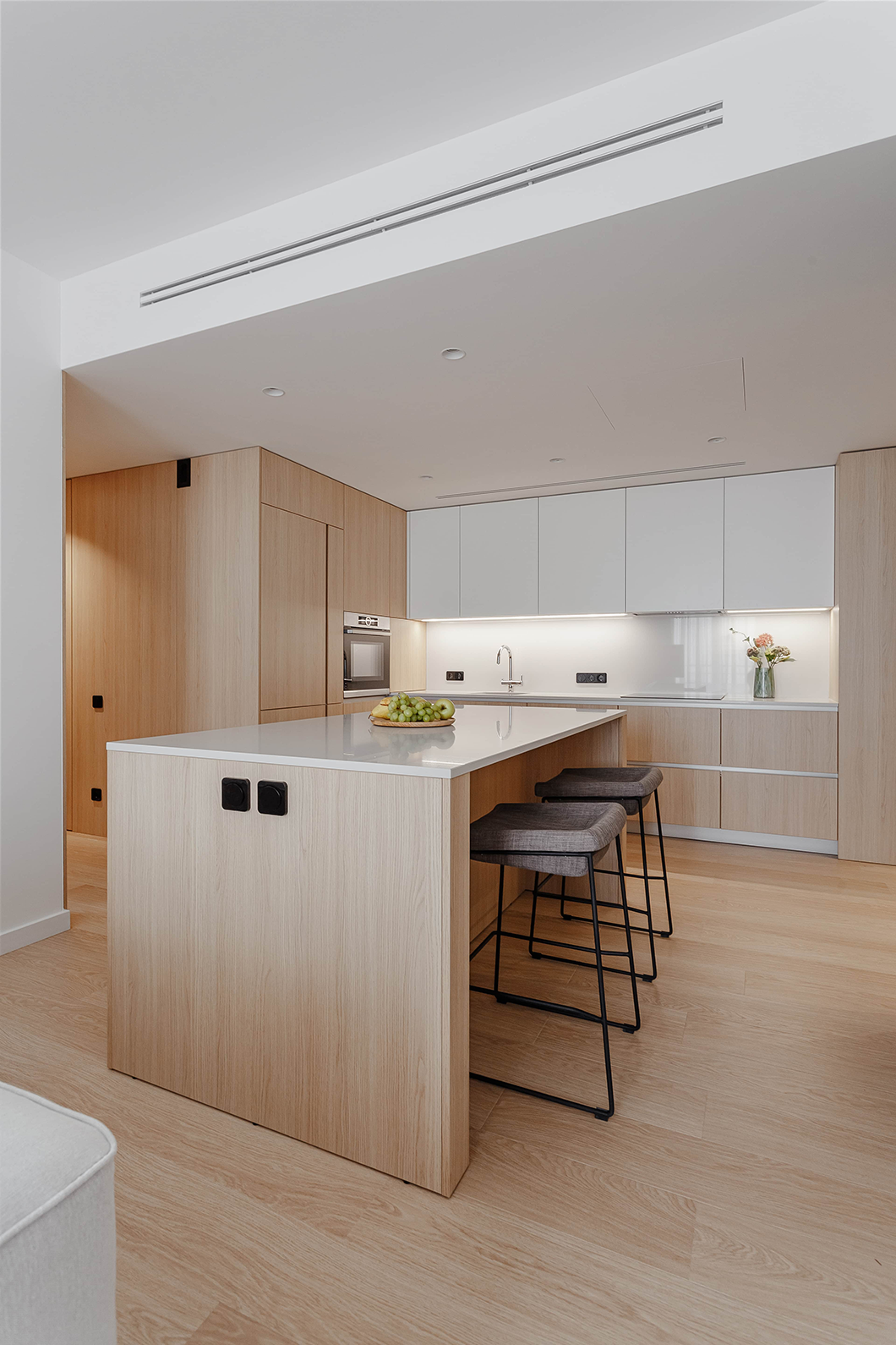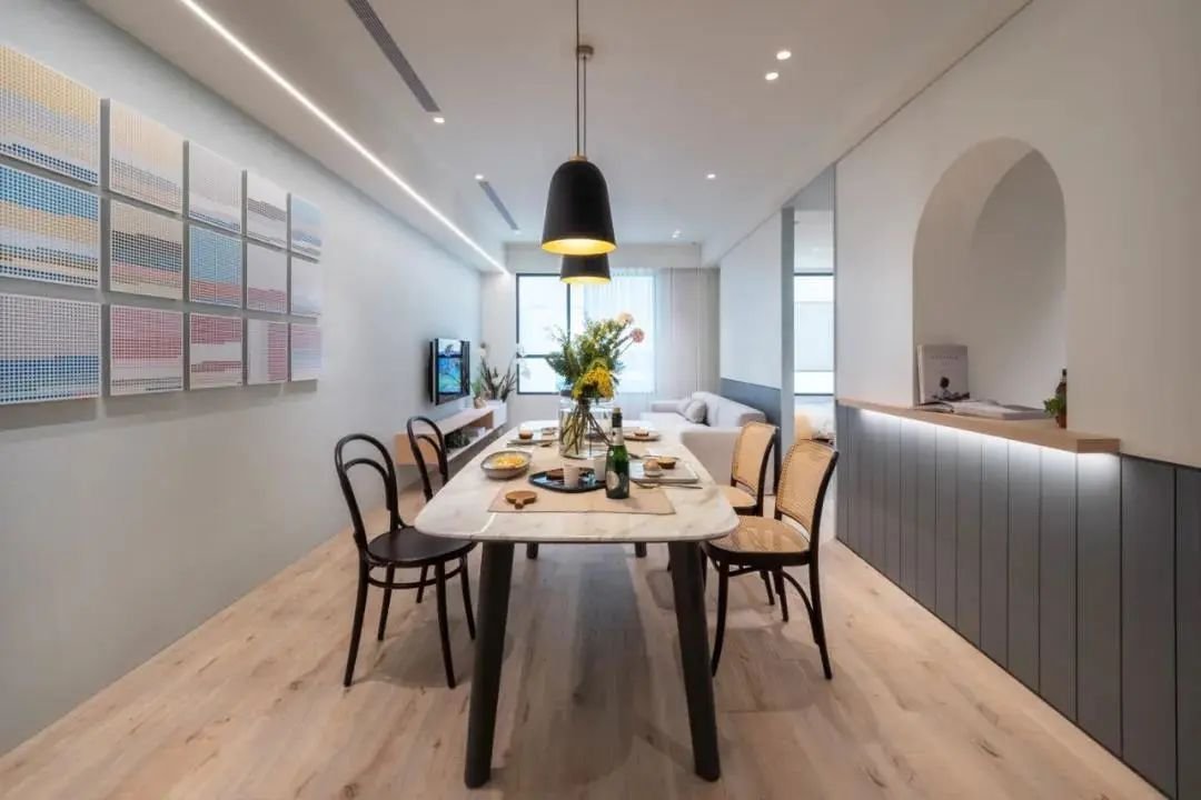 把中西廚分開(kāi),中廚獨(dú)立布局,西廚以島臺(tái)、吧臺(tái)、餐邊柜等形式呈現(xiàn),完美避開(kāi)燃?xì)獾陌踩[患: