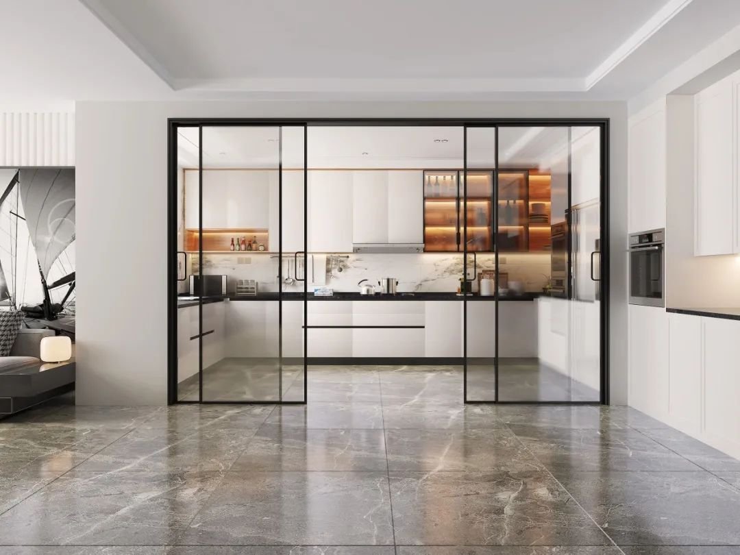 把門洞擴(kuò)至最大,做半開(kāi)放廚房,并用玻璃門增加通透感: