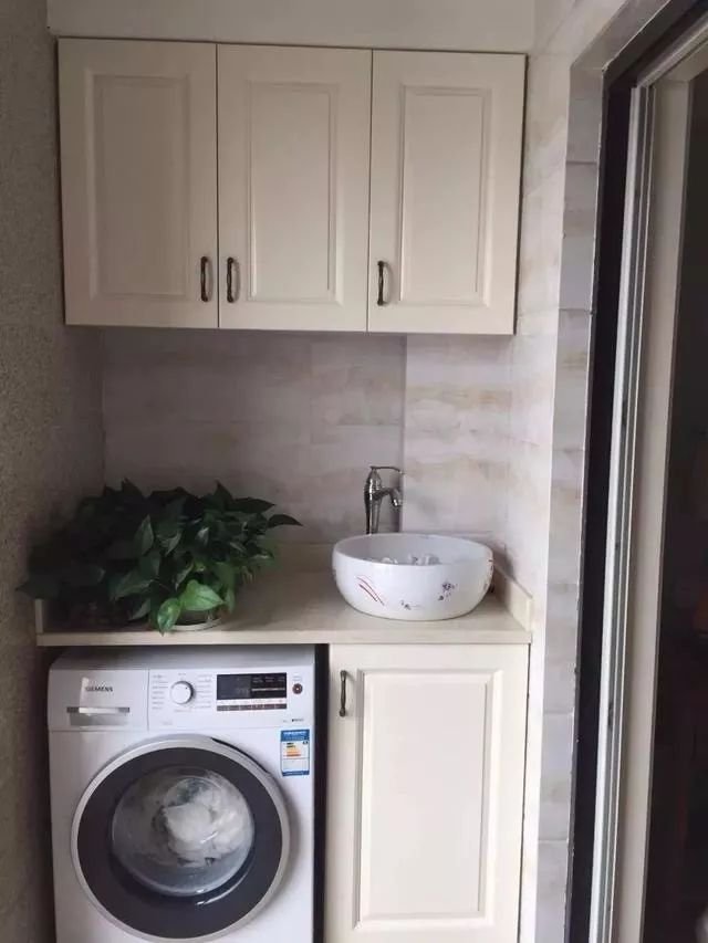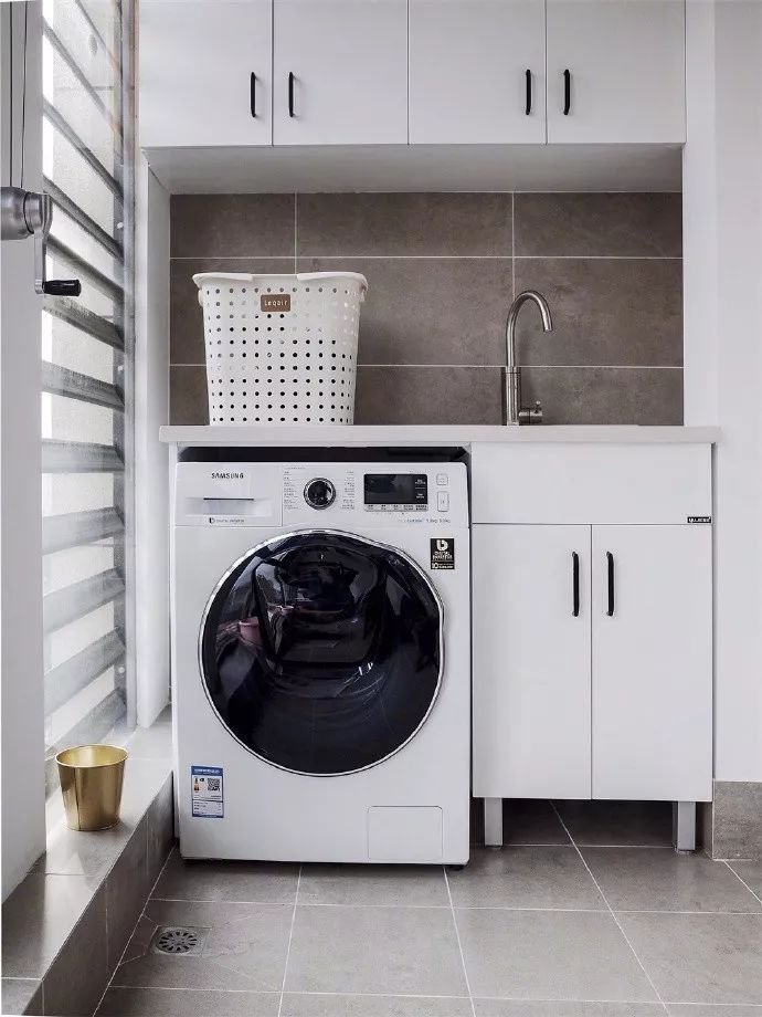 在小戶型陽(yáng)臺(tái)的一側(cè)做上洗衣機(jī)、洗手臺(tái)和吊柜的組合式設(shè)計(jì),選擇滾筒洗衣機(jī),這樣上方的臺(tái)面空間也能用起來(lái),非常實(shí)用。