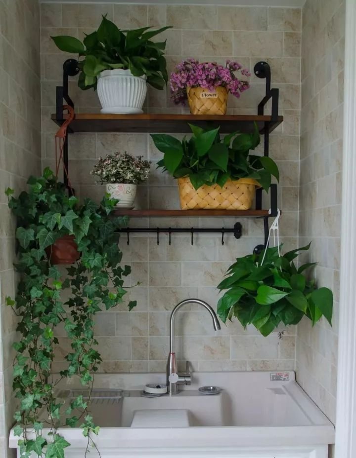 陽(yáng)臺(tái)的洗手臺(tái)上方空間可以考慮做置物架來(lái)放點(diǎn)綠植,或者直接掛墻上,這樣不會(huì)占用多少的空間,又能讓你家多出一些自然感。