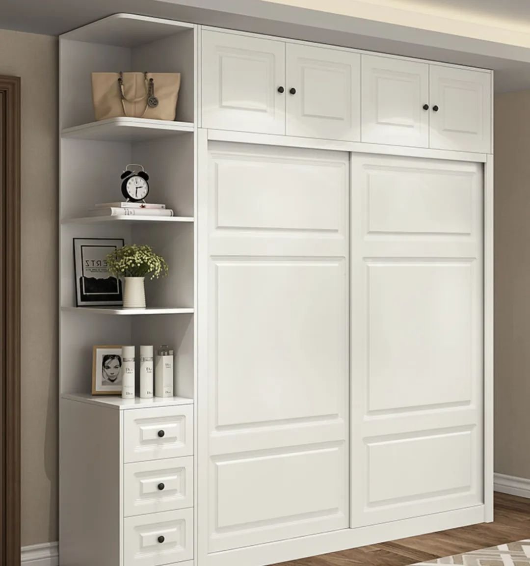 平開門可以兩側(cè)門同時打開,放大件物品,或者想好好挑選衣物時比較方便;而推拉門一次只能打開一側(cè),在這一點上就比不上平開門了。