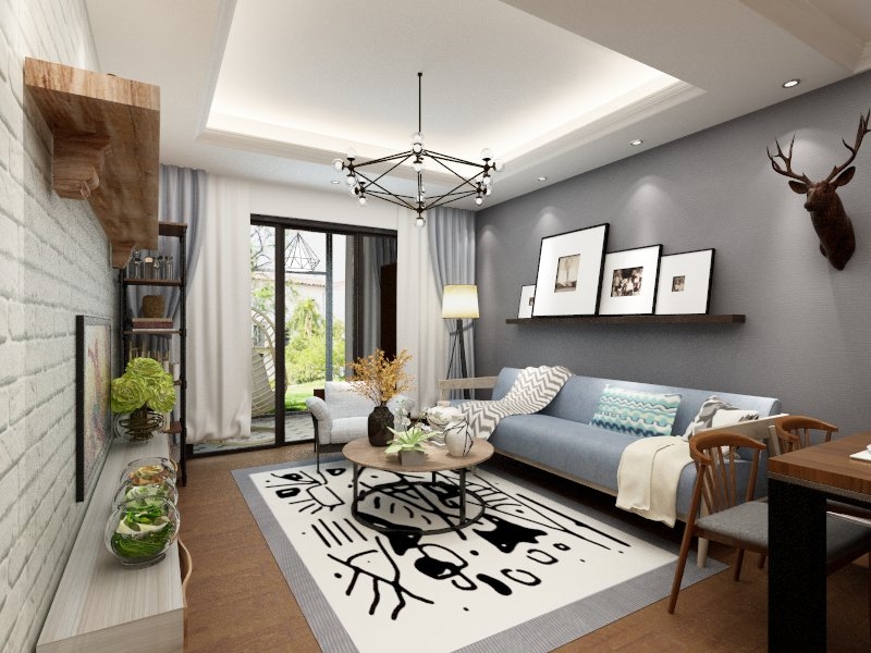 ▲ 客廳沙發(fā)背景墻采用調色灰色乳膠漆,更有質感,搭配裝飾鹿頭和木制層板裝飾照片架,營造簡單復古的神秘感