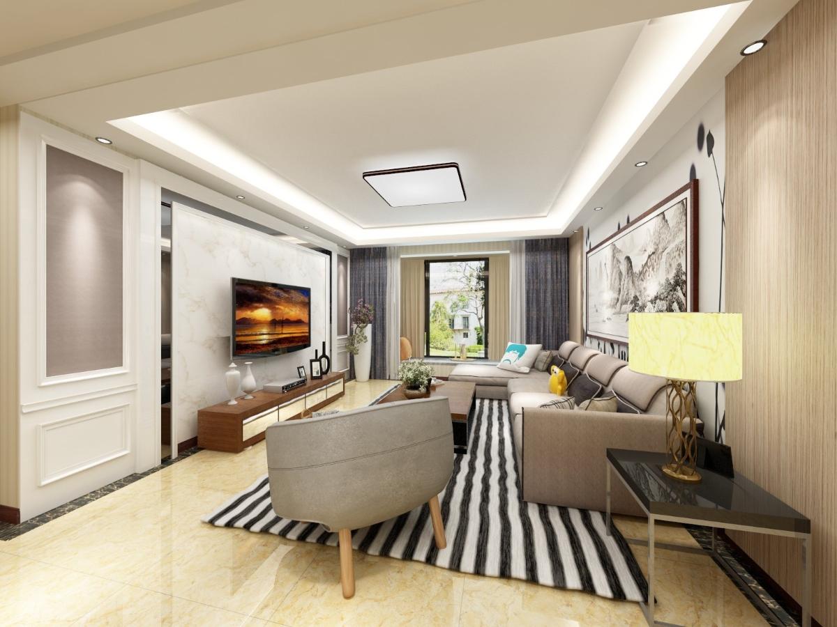 ▲ 電視背景墻部分設計大理石飾面結合邊框線條內嵌黑鏡,沙發(fā)背景墻定制木飾面與電視背景墻相呼應,整體空間簡潔,富有質感。
