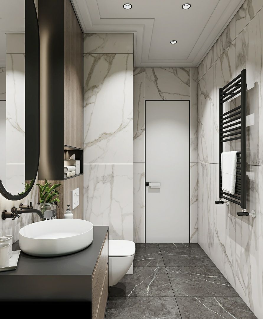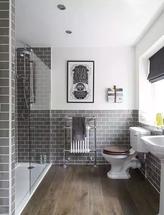 比如下面這個狹長的衛(wèi)生間,墻面和地面的瓷磚都采用了橫向拼接的鋪貼方式,無形中增加了視覺上的寬度,空間平衡度變得更加和諧。