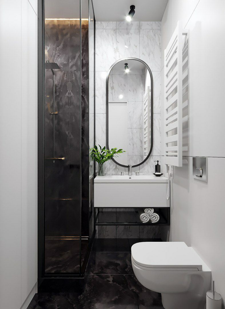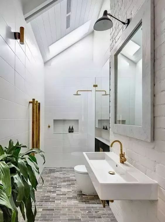 如果你的浴室已經(jīng)非常狹長,隧道形,就不要再去強調(diào)長度了,一定要更多考慮從視覺上去伸展寬度。