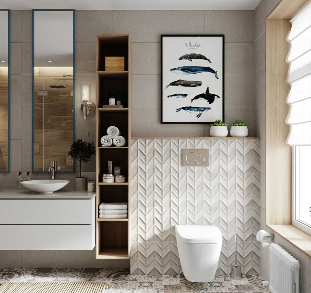 無論你家的浴室是典型的矩形還是奇形怪狀,總能找到一個比其他地方稍長的墻壁或區(qū)域。在這些區(qū)域添加一個架子、一個瓷磚帶,甚至一個簡單的條紋墻漆都可以幫助你拉長房間最長的線條,并將視線吸引到最遠位置,讓空間產(chǎn)生延伸感。