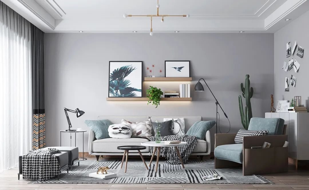 客廳區(qū)域可以用置物架做收納,這樣書籍、各樣擺件就有了歸處,同時保留了視線的通暢,不會對光源進行隔離。
