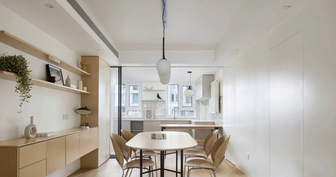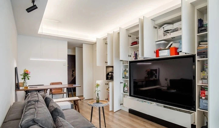 想要家里盡可能多的儲物柜子,又要避免柜子太多造成擁堵感,就要針對一面墻進行設計,不破壞空間整體性,柜子隱入墻體,削弱柜子的厚重感。