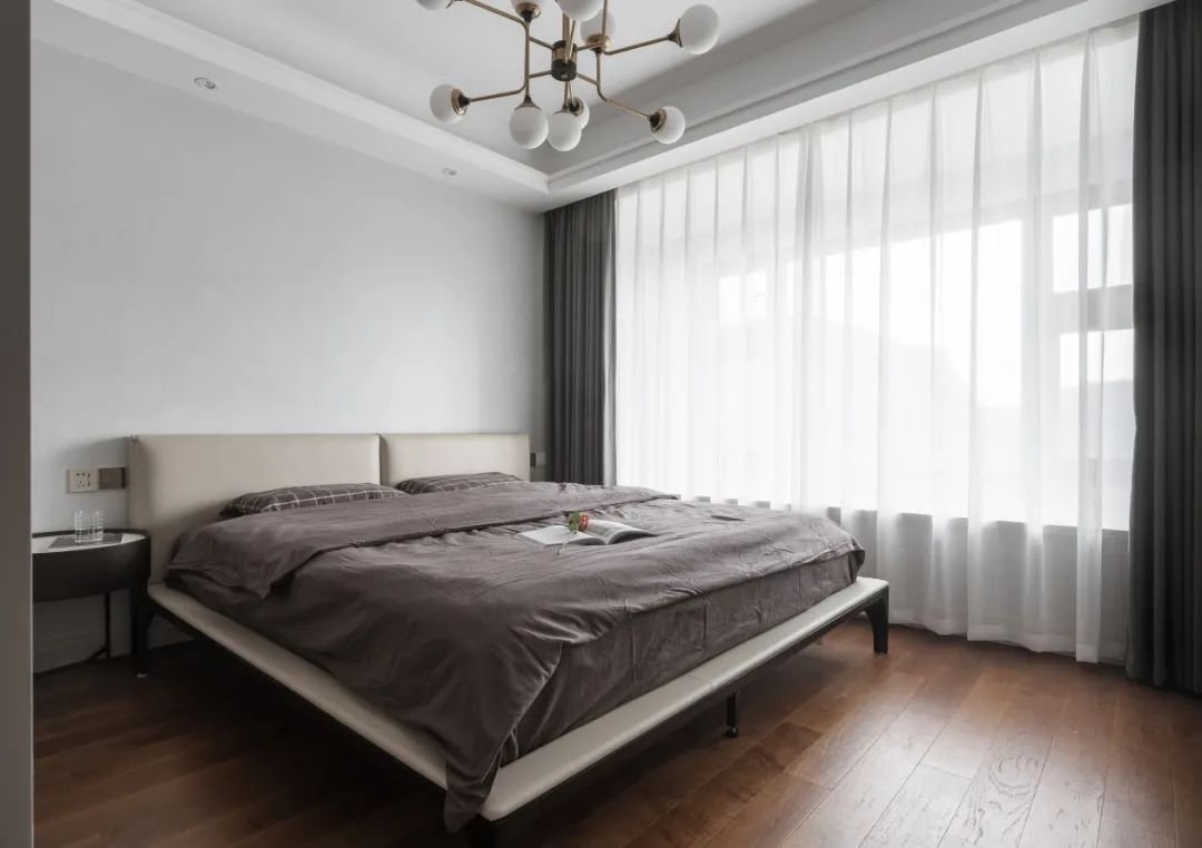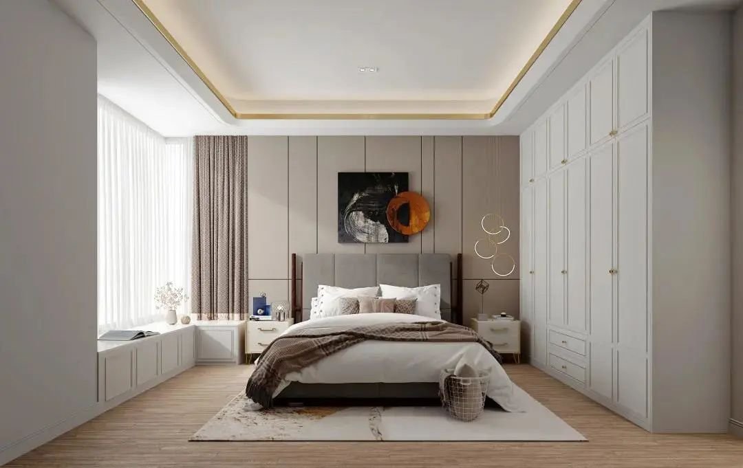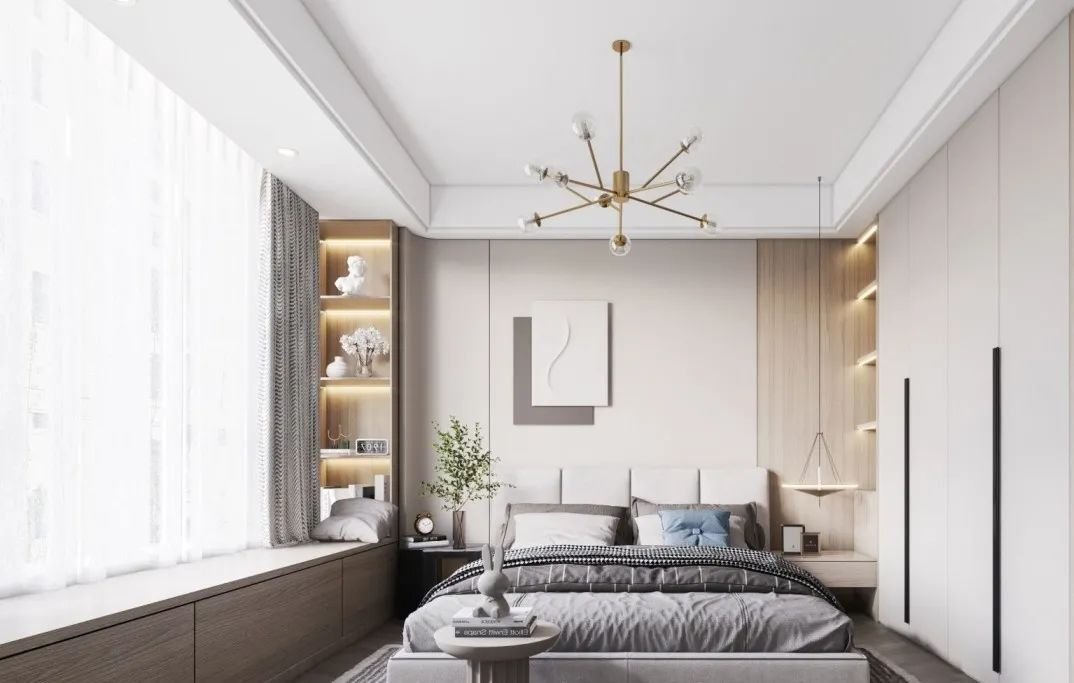 ②飄窗兩邊,適當(dāng)?shù)脑O(shè)計(jì)展柜書柜,充分利用墻面空間擴(kuò)容收納。