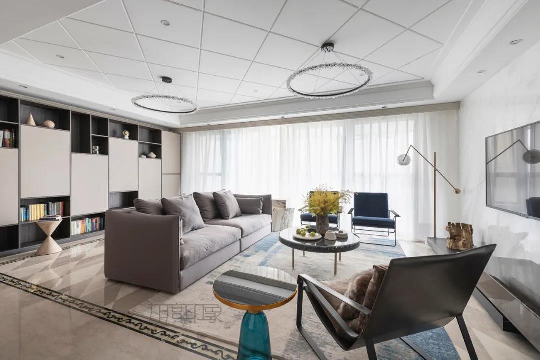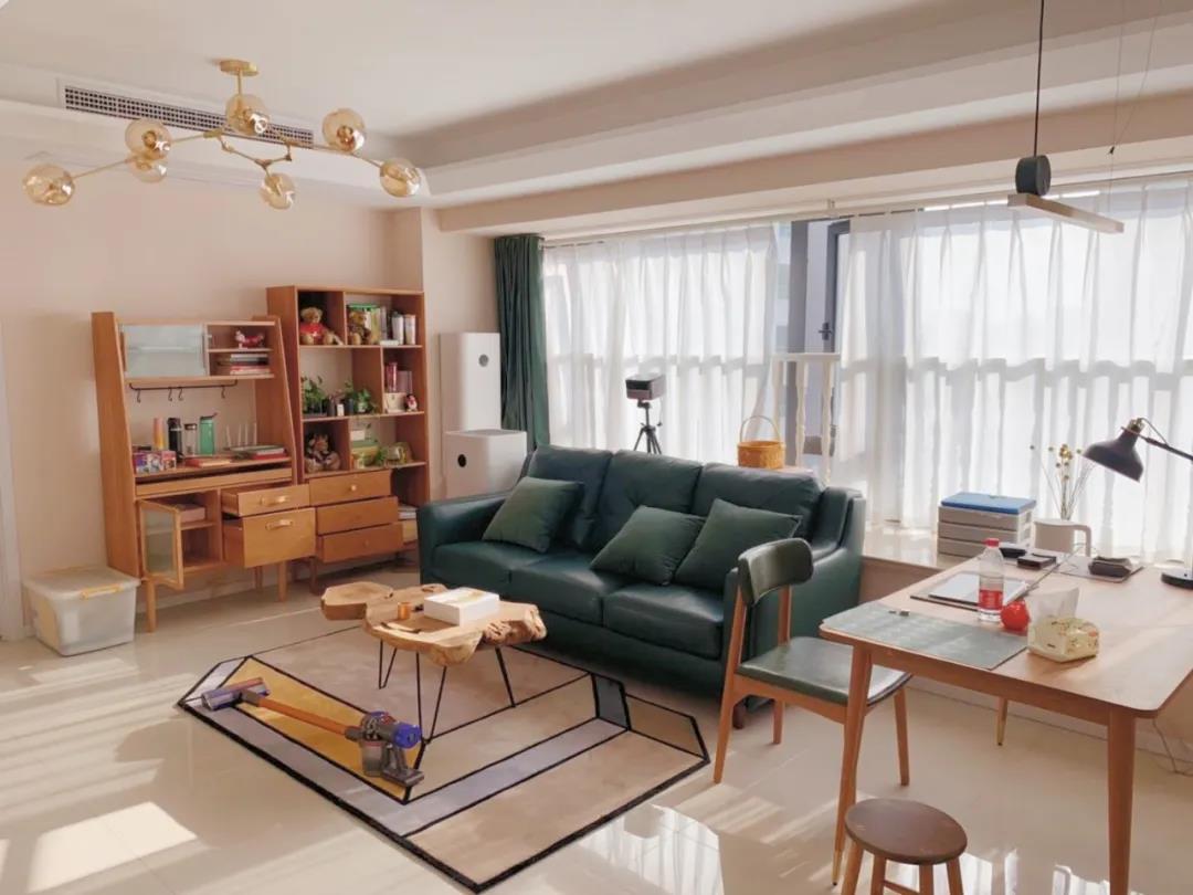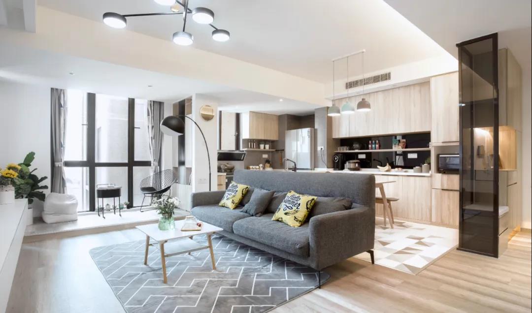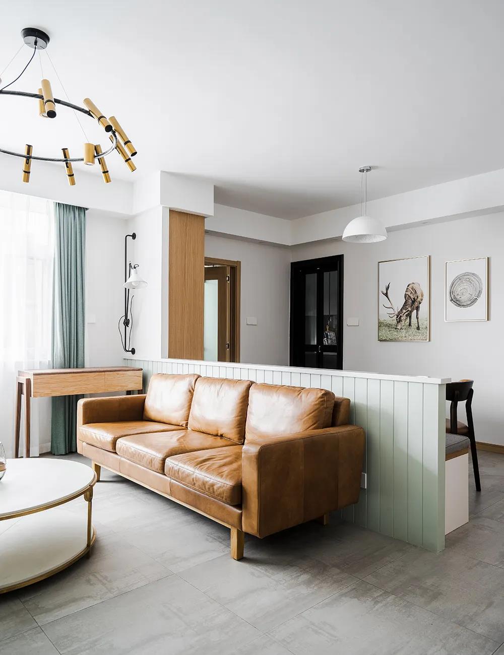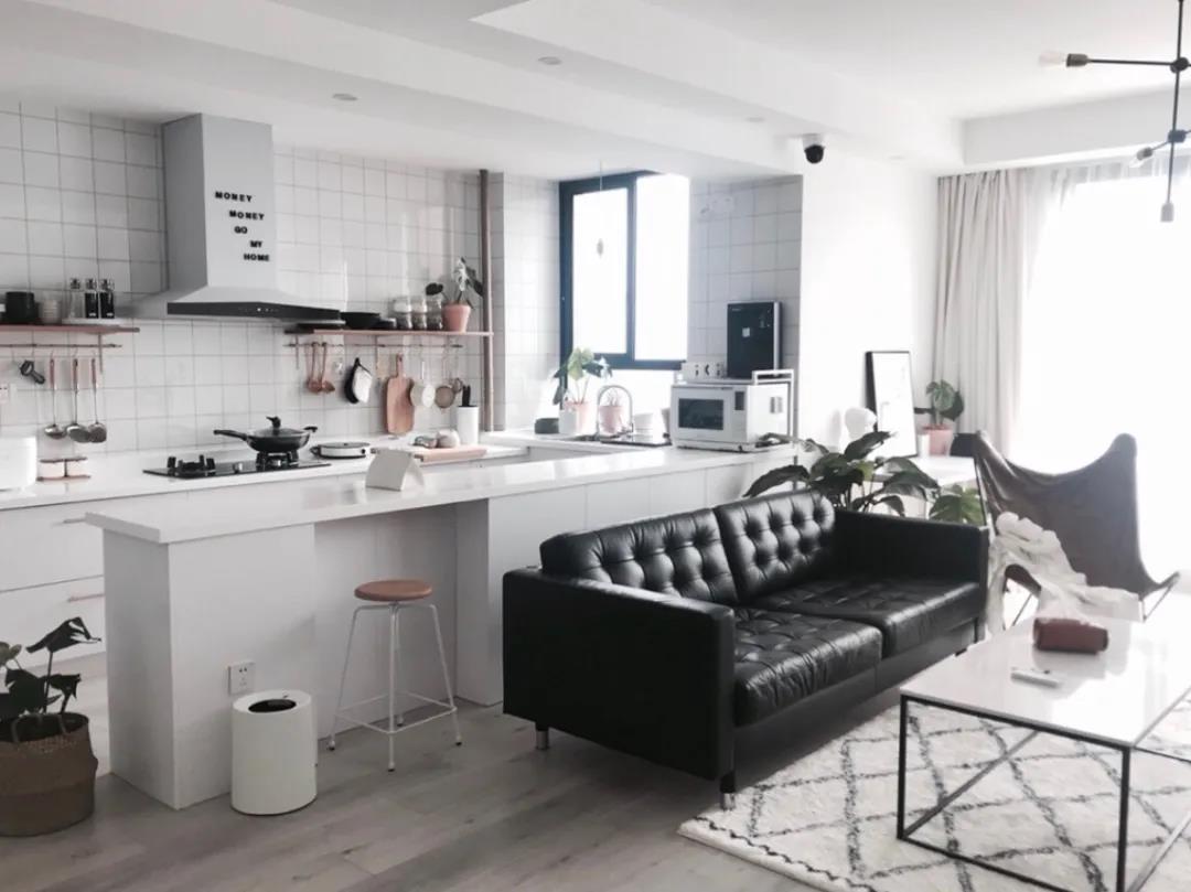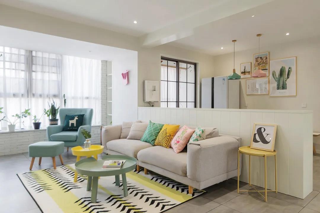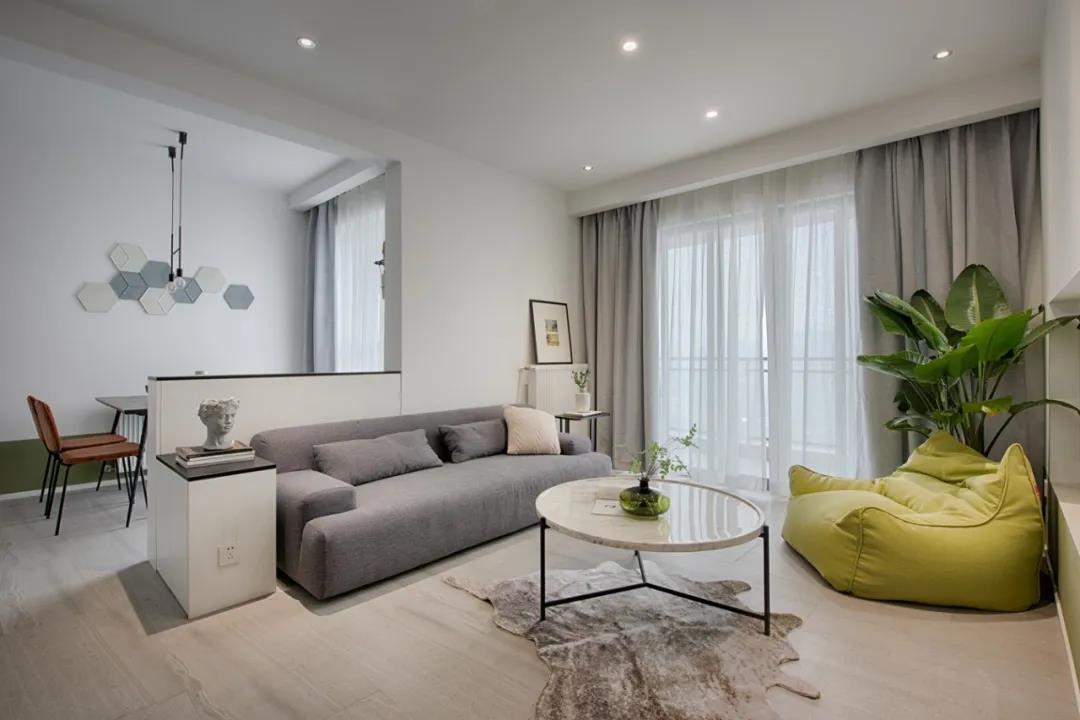 沙發(fā)不靠墻放感覺不踏實的話,可以在客餐廳中間砌個矮墻,然后沙發(fā)靠著矮墻布置,既能緩解不踏實的感受,又能保持空間的通透大方。
