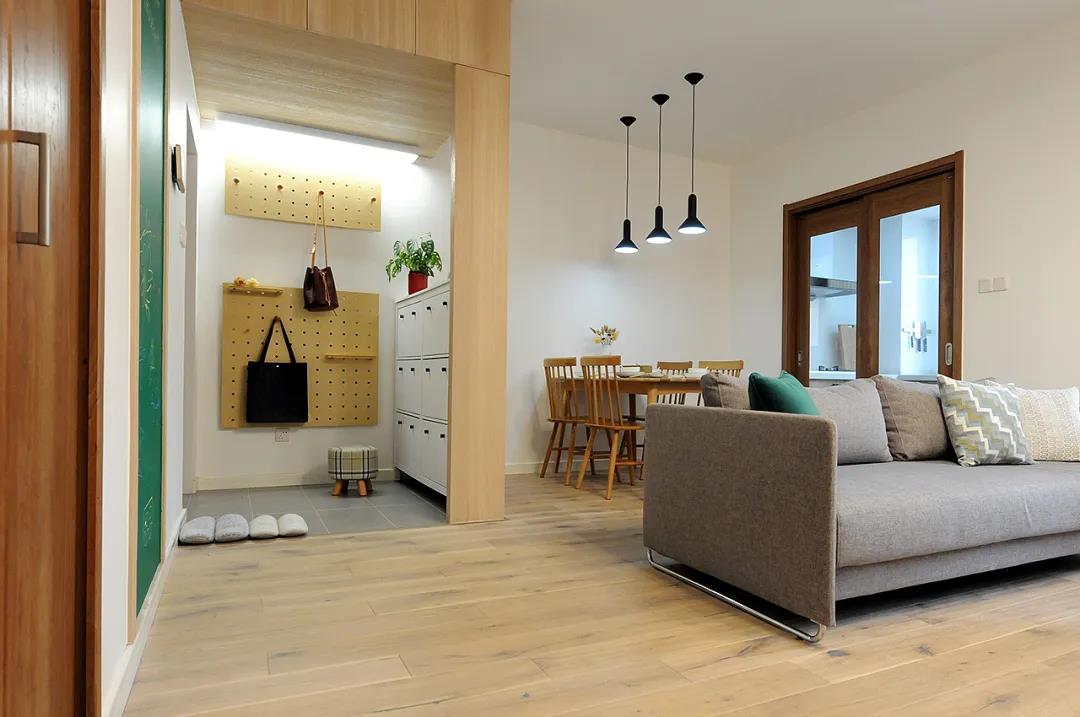 家庭成員沒有什么特殊的要求的話,直接在沙發(fā)后方布置餐桌椅,這樣也是橫廳戶型中比較常見的布置方案。
